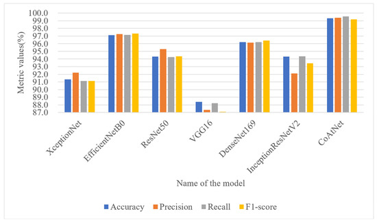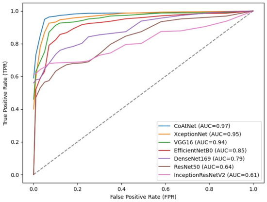 To further validate the effectiveness of the proposed detection model, which combines stacked depthwise separable convolution and attention mechanisms, in achieving higher recognition accuracy for malicious code families, a comparative experiment was conducted against classical deep learning models. The evaluation metrics used were Accuracy, Precision, Recall, and F1-score. On the Malimg dataset, the detection model incorporating stacked depthwise separable convolution and attention mechanisms demonstrated superior performance, as illustrated in Figure 14. It achieved an impressive accuracy of 99.33%, surpassing the performance of XceptionNet, EfficientNetB0, ResNet50, VGG16, DenseNet169, and InceptionResNetV2 models by 7.99%, 2.21%, 5.02%, 10.92%, 3.11%, and 5% respectively. The ROC curve is a commonly used performance evaluation tool that displays the trade-off relationship between a model’s true positive rate and false positive rate at different classification thresholds. The AUC value ranges from 0 to 1. In an ideal situation, a perfect prediction by the ROC curve results in an AUC of 1, and vice versa. The proposed model has an AUC of 0.99 on the Malimg dataset, as shown in Figure 15, which is higher than other models in terms of the area under the curve (AUC value). This result further confirms the model’s excellent performance within the threshold range. These notable improvements highlight the effectiveness of the proposed model and underscore the advantages brought by the convolutional network’s inherent translational equivariance, which enhances the model’s ability to generalize well to diverse malware samples. To examine the proposed model’s adaptability to dataset size, a comparative experiment was conducted on the Blended+ dataset, using the same six deep learning models for evaluation. As depicted in Figure 16, the proposed model achieved an accuracy of 96.60% on the Blended+ dataset, surpassing the performance of the aforementioned models by 4.29%, 1.37%, 2.19%, 4.37%, 3.36%, and 3.15% respectively. In addition, the proposed model demonstrated higher recall and F1-score in comparison to the other models. This further showcases its ability to adapt well to large datasets and maintain robust performance across varying data sizes. Similarly, the AUC value for the Blended+ dataset is 0.97, as shown in Figure 17 which is superior to the other six models, indicating its excellent performance in this dataset as well. Overall, the proposed model surpasses other models in terms of both generalization ability and adaptability to datasets of varying sizes. The significant improvements in Accuracy, Recall, and F1-score further validate the effectiveness of the model in accurately classifying malicious code families. These findings highlight the potential of combining stacked depthwise separable convolution and attention mechanisms in designing robust and adaptable deep learning models for malware detection applications.