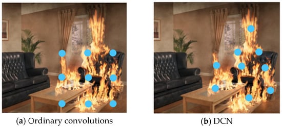 In traditional convolution, the sampling points are evenly and regularly distributed. For example, in Figure 1a, the sampling points in the ordinary 3 × 3 convolution are regular. However, for instances with irregular shapes like fire and smoke, we hope that the sampling points of the convolution kernel will also be uneven and irregular to better fit the contour of instances. In other words, the convolution can have a “deformation” ability, as shown in Figure 1b. Therefore, we use DCN in the ADFireNet network backbone to adapt to the irregular shapes of flames and smoke.