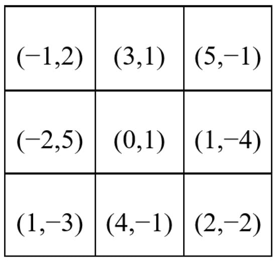 The sampling point positions of the DCN can be offset, learned through the 4-layer convolution. For the input feature map with size H × W × C (H, W, and C represent the height, width, and channels of the feature map, respectively), a convolution kernel with a 3 × 3 size is used for sampling in the next step; that is, there are a total of nine sampling points in the convolution kernel. Before this step, the feature map was first made to pass through the 4-layers convolution kernels in the DCN branch, and the paddings of all convolution kernels were set to “same” to keep the feature map size unchanged. The last convolution kernel is set as 3 × 3 × (2 × 9), hence the offset output with size H × W × (2 × 9) is obtained. H × W means that each point on the input feature map has a corresponding offset. (2 × 9) indicates that there are offsets in the X and Y axes for all nine sampling points. We assume that the offsets can be expressed as shown in Figure 2 after combining the X and Y axes, and the coordinates in each grid represent the offset distance of the sampling points.