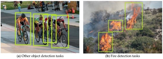 Compared with other object detection tasks, fire detection is associated with some difficulties: the size and shape of fire and smoke instances are not fixed. As shown in Figure 3a, four instances belonging to the same category of cyclists have similar aspect ratios and sizes of bounding boxes; however, fire detection does not have these characteristics. As shown in Figure 3b, the sizes and aspect ratios of the three fire instances are different. Therefore, the anchor-free network is used in this paper. In anchor-based networks, the size and aspect ratio of anchors are artificially set in advance, which is not suitable for tasks such as fire detection where the size and shape of the instances are variable. Fire detection has the above characteristics because the fire and smoke instances in the detection task are not rigid bodies but complex and variable. DCN is used to solve the feature extraction problem of fire and smoke shapes, and FPN combined with pseudo-IoU is used to solve the problem of changing sizes.