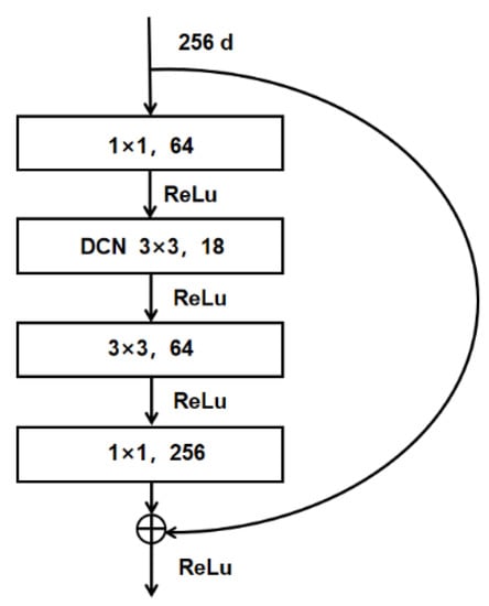 Considering the number of parameters and detection speed, ResNet-50 is used as a backbone network in ADFireNet. Resnet-50 is composed of five convolution blocks: conv_1–conv_5. The five feature maps generated by these five convolution blocks are denoted as C1–C5 in Figure 4. The down-sampling steps between each convolution block increase exponentially by 2, such that the down-sampling rate of the Ci layer is 2i. Each convolution block consists of several residual blocks. To avoid adding too much computation, DCN is added to the last residual block of the three convolution blocks: conv_3, conv_4, and conv_5. The shape features of the flame extracted by adding the residual block of DCN are transmitted to the P3, P4, and P5 layers of the subsequent FPN. The residual block structure obtained after adding DCN is shown in Figure 5.