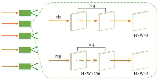 The head network is connected to the FPN in each layer and is composed of classification and regression sub-networks. It outputs the classification confidence score and the parameters of the bounding box, respectively. The classification network is composed of four layers of 3 × 3 × 256 full convolutional network. A 3-channel convolution layer is connected to them to divide each point into three categories: fire, smoke, and background. The first four layers of the regression sub-network are similar to those of the classification sub-network, except that the number of channels in the last layer is four, representing the distances from this point to the four edges of the predicted bounding box. For each point in the input image, the network gives the category confidence score and the size of the bounding box. The head network structure is shown in Figure 6: