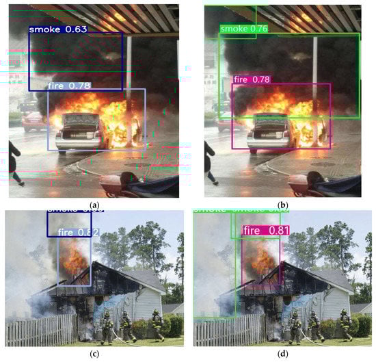 Figure 8 visually illustrates the impact of DCN on detection performance. Figure 8a shows the effect of using the without DCN_50 layers for flame and smoke detection. ADFireNet_50 is used to detect the same scene, as shown in Figure 8b. Figure 8c shows the effect of using the without DCN_50 layers for flame and smoke detection in another scene. ADFireNet_50 is used to detect the same scene, as shown in Figure 8d. DCN has a greater ability to extract features of irregular targets, for example, flames and smoke. When using AFFireNet_50 with the help of DCN to detect the first scene, the range of smoke contained in the detection box is larger, the positioning of smoke is more accurate, and the smoke in the upper left corner is detected. In the second scenario, AFFireNet_50 detected white smoke that had not been detected before on the left side. The detection effect in Figure 8 demonstrates that adding DCN can improve the positioning accuracy of the network and detect previously missed instances.