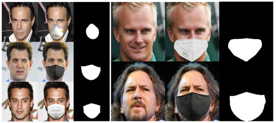 Samples from the synthetic dataset illustrating different sizes (256 × 256 and 512 × 512). The first column displays the original unmasked face images, the second column shows the corresponding masked face images, and the third column represents the binary mask map.