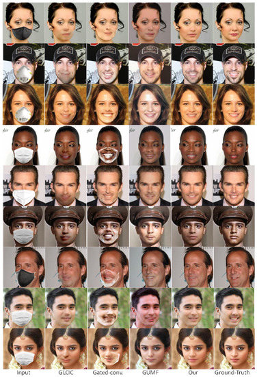 - Li, Y.; Liu, S.; Yang, J.; Yang, M.H. Generative face completion. In Proceedings of the IEEE Conference on Computer Vision and Pattern Recognition, Honolulu, HI, USA, 21–26 July 2017; pp. 3911–3919. [Google Scholar]
