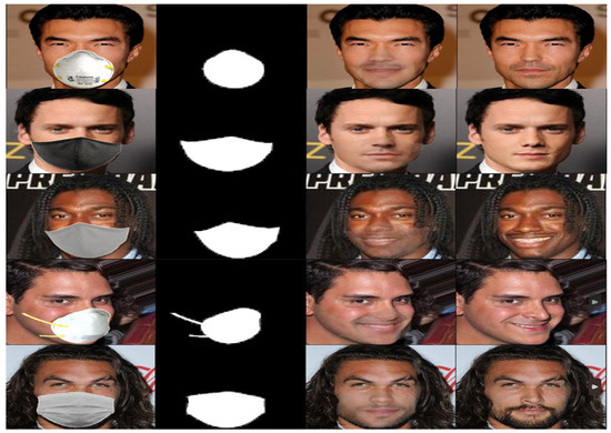 Some samples of the proposed model’s results on front-facing images. Each sample includes the input masked face, the generated binary mask map, the proposed model’s output, and the ground truth.