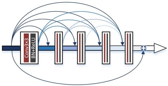Visible images have a higher spatial resolution and contain more texture details. Therefore, we design a visible feature extraction module with a residual dense block (RDB) [] to extract the visible features. In this module, we first extract and obtain visible shallow features using three convolution layers, followed by deep feature extraction using the RDB. The RDB consists of five convolution layers, as shown in Figure 3. Each convolution layer can acquire the features of all previous layers through local dense connections, thus making full use of the features of each layer. The final convolution layer filters all the previous features and adaptively controls the output information. Finally, the shallow and deep feature results are combined using residual connectivity, and the residual connectivity enhances the gradient connectivity, which can effectively prevent the gradient from disappearing. The visible image can fully extract its local features through its feature extraction module, prevents the degradation of intermediate features, and obtains a feature map with rich texture detail features.