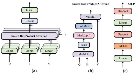 Transformer’s component structure. (a) MSA structure details; (b) Scaled Dot–Product Attention structure details; (c) MLP structure details.