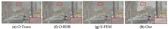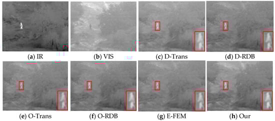 Figure 5 and Figure 6 show the fusion results of the TNO and RoadScene datasets, respectively. To allow for better comparison, we zoomed in for a close-up of a local area in each fusion result. From the fusion results of D-Trans and D-RDB, it can be seen that we changed the asymmetric network to a two-stream symmetric network, resulting in blurred edges of infrared targets and insufficient clarity of the scene, which indicates that the proposed asymmetric network has better complementary information preservation capabilities. In the absence of the transformer module, the infrared feature extraction module cannot capture the infrared protruding target well due to the failure to build the long-distance dependency. Therefore, the infrared character target in Figure 5 and the clouds in the sky in Figure 6 are relatively blurry. As for the case without RDB, we can see that its results fail to fully extract the visible details; although the infrared target is better maintained, the background texture of the fused image and the landmark lines of the RoadScene are not clear enough. In addition, the E-FEM fusion is not well preserved in both infrared target and texture details, which proves the effectiveness of the transformer and RDB for infrared and visible feature extraction, respectively.
