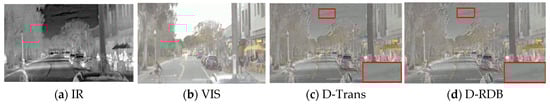 To investigate the effectiveness of our asymmetric network structure, transformer-based infrared feature extraction module, and RDB-based visible feature extraction module, we performed ablation validation on the TNO and RoadScene datasets. We divided the model structure into five groups of types. (a) Transformer-based dual-stream symmetric network (D-Trans)—in order to verify the effectiveness of the asymmetric network structure, we applied the infrared feature extraction module of this paper to visible image feature extraction and constructed a symmetric network. (b) RDB-based dual-stream symmetric network (D-RDB)—to verify the effectiveness of the asymmetric network structure, we applied the visible feature extraction module of this paper to infrared image feature extraction. (c) Without Transformer (O-Trans)—in order to investigate the importance of the transformer, we moved the transformer out of the infrared feature extraction module to study its function. (d) Without RDB (O-RDB)—to verify the necessity of RDB, we removed the RDB in the network to illustrate its validity. (e) To verify the effectiveness of the transformer and RDB for infrared and visible feature extraction, respectively, we exchanged their extraction modules (E-FEM).