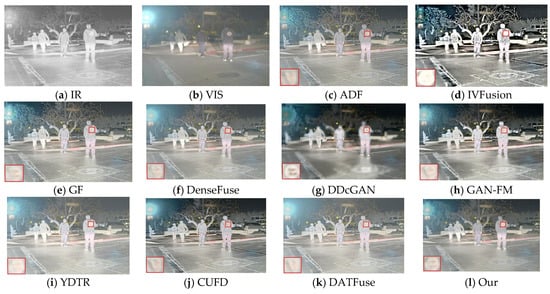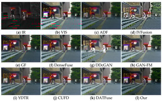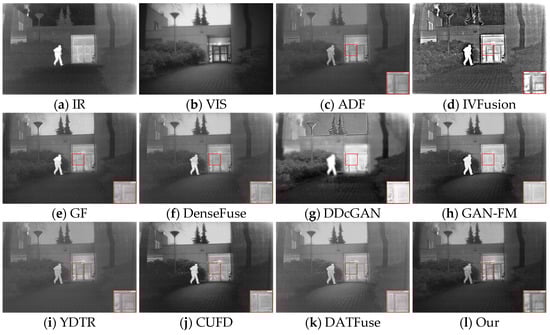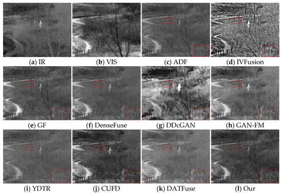 The second set of source images and their fused image results for different methods are shown in Figure 11. It is obvious that our fusion results are better than the other nine methods from the viewpoint of visual effect, preservation of texture details, and significant target. The methods of CUFD, DATFuse, GAN-FM, and YDTR do not retain enough texture details, the background information of tree branches and railings is blurred, and the intensity information of infrared is too low, resulting in low contrast between light and dark in the fused image. Although the ADF and GF methods retain relatively clear background information, it can be observed from the areas with rich texture details in the red box that the fusion effect is still our method.