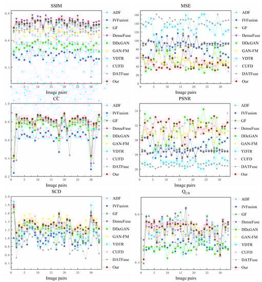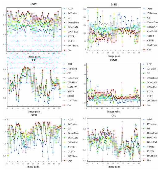 We selected 51 image pairs from the TNO dataset for quantitative evaluation. Figure 12 displays the performance metrics for each fusion result, while Table 3 shows the average performance metric values for these fusion methods. For each metric, the best and second-best fusion results for all methods are marked in bold and underlined, respectively. As can be seen in several figures, our method has significant advantages on SSIM, MSE, CC, PSNR, and QCB on the TNO dataset. This phenomenon implies that our fused images have the best visual effect and contain rich texture information and infrared salient target information. In addition, our method ranks second in SCD, which indicates that our method transfers enough source image information to the fused images.