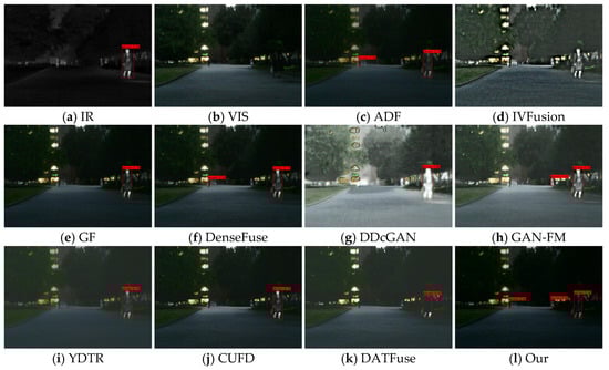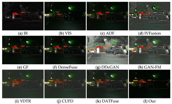 Figure 13, Figure 14 and Figure 15 show some typical source images and the detection results of different methods. From the visualization results, we can find that visible images contain rich background information but are difficult to detect salient targets, while infrared images can provide sufficient semantic information about salient targets (e.g., people), and the target has high contrast with the background, which is more helpful for detectors to detect salient targets. Different fusion algorithms can integrate the complementary information of these two images; however, the performance of fusion and detection differs due to the difference in methods. For example, in the 00004N scenario, the methods of IVFusion, GF, DDcGAN, YDTR, CUFD, and DATFuse detect only one person. ADF, DenseFuse, and GAN-FM detect two people, while our method can detect three persons. A similar scenario occurs in the 00726N scene, where only our method and CUFD accurately detect people, cars, and trucks. This shows that our method fully integrates the intensity information of infrared images and the texture information of visible and is suitable for subsequent image applications.