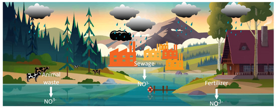 Nitrate ions affect nature significantly. The presence of nitrate ions can have a significant impact on the environment [4]. When present in nominal amounts, they can promote aquatic life. However, an excessive amount of nitrate could lead to harmful effects on the aquatic ecosystem, such as the increased production of algae and phytoplankton, stimulating eutrophication, as illustrated in Figure 1. As these organisms decompose, they utilize more oxygen, leading to adverse effects on marine life. Similarly, nitrate poisoning can also occur in animal farming, resulting in livestock abortions and reduced dairy production, which lead to significant losses for farmers [5]. On the other hand, nitrate consumption can be beneficial to humans, as it can improve blood flow and lower blood pressure [6]. Meanwhile, excessive nitrate intake is always hazardous for humans and animals. Nitrate can be used as a food preservative in the food processing industry, and it often helps in curing meat; hence, it is mostly used in fish and salted meat preparation.