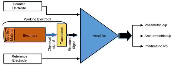 In the electrochemical methods, oxidation or reduction are used to produce a current to detect a particular analyte [17]. The primary element of any electrochemical sensor is an electrochemical transducer. A transducer consists of a sensing element that reacts with the target analyte and transforms the chemical reaction into an analytical signal. Typically, the electrochemical sensor is a three-electrode system that includes a reference electrode (RE), sensing/working electrode (WE), and counter electrode (CE). The electrolyte reaction occurs at the working electrode. This electrode is generally modified with a nanomaterial to accelerate the electrolytic reaction. The reference electrode allows the correct application of the working electrode potential. The counter electrode is used to complete the circuit and helps continue the electron flow [6]. Figure 2 illustrates the working principle of the method in a three-electrode system.
