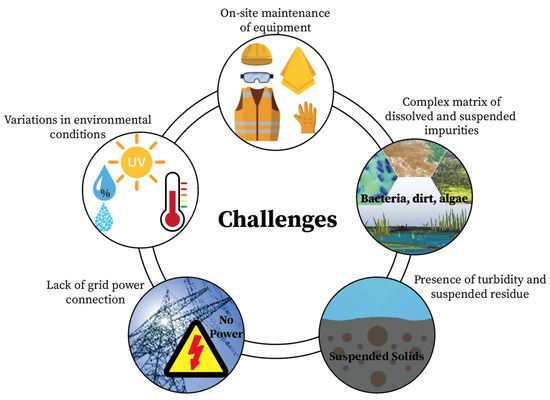 Several analytical techniques can be conceivably employed for the real-time detection of nitrate, such as chromatography, UV spectroscopy, various colorimetric methods, and electrochemistry [80]. However, each of these methods encounters one or more challenges during implementation (Figure 6). Most of the time, natural waters are situated in remote places, where there can be a lack of grid-power connection. Environmental and temperature conditions are not constant all the time. Additionally, factors such as changing levels of turbidity and suspended residue in natural waters can limit the performance reliability of the analytical equipment [16,80]. Furthermore, restrictions on accessing, cleaning, and servicing should be considered. Many inline nitrate sensors require the regular and effective cleaning of the probes to ensure accurate readings. The cost of cleaning is a significant factor, sometimes making up 50% of the operational expenses. Common cleaning techniques include ultrasonic, brush, water-jet, and chemical-based automatic cleaners. However, some new and cost-effective methods have been suggested, such as electrolysis, which actively removes buildup, or using copper mesh or CuO2-doped materials, which passively prevent fouling [84].