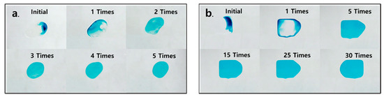 Figure 8). Therefore, it was confirmed that after 30 times of mixing, complete mixing had occurred in the droplets, with a mixing time of approximately 36.23 s. However, the yields after 30 times of mixing using the Re EWOD Chip were only comparable to those achieved with the Barrier EWOD Chip after five times of mixing, demonstrating that the mixing efficiency of the Barrier EWOD chip is six times higher than that of the Re EWOD Chip. Additionally, it is worth noting that the Re EWOD Chip required more mixing to achieve a complete reaction, further highlighting the effectiveness of the Barrier EWOD Chip.