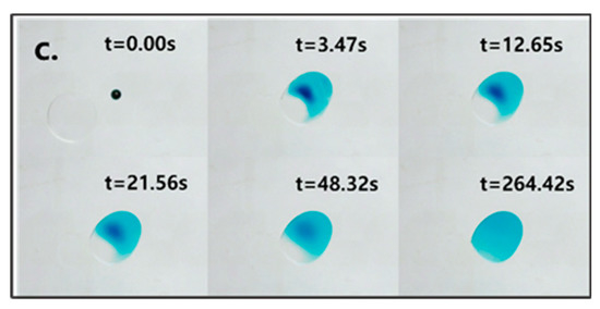 μm = 0.994, taking 42.89 s. The mixing efficiency of the Barrier EWOD Chip is six times that of the Re EWOD Chip. To rule out the influence of spontaneous diffusion, we analyzed the spontaneous diffusion of the dye within the droplet. It was observed that the diffusion velocity of the dye within the droplet was very low and had a negligible impact on the experiment. Even after 720 s, the blue dye had not completely diffused in 0.65 μL of DI water, with the