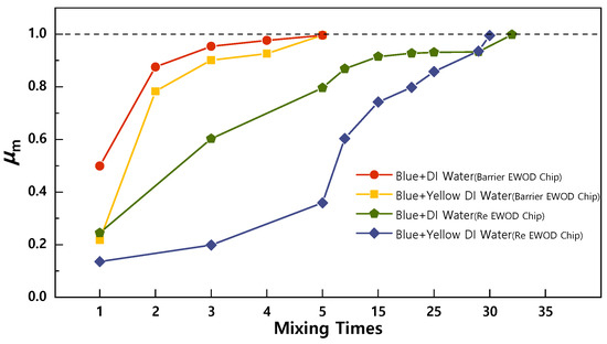 μm = 0.996) within five times of mixing, taking 5.26 s. While, the Re EWOD Chip needs 30 times of mixing to achieve
