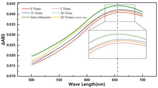 The Barrier EWOD Chip was used for the rapid mixing of the sorbitol solution and detection solution, and then the ability of the chip to mix was verified by detecting the amount of generated product. The sorbitol concentration detection reagent kit used in the experiment was purchased from Beijing Solarbio Science & Technology Co., Ltd. (Beijing, China). Before the experiment, the sorbitol powder was dissolved in DI water to prepare a 2 mg/mL standard solution for use, and 2 mL of DI water was reserved for use in the waiting-to-be-tested tube (WT tube). During the experiment, 0.5 μL of the sorbitol solution was first dripped onto the chip, and then 0.15 μL of detection reagents 1 and 2 were added in sequence to form a mixture. After mixing the mixture 0 times, 5 times, 15 times, and 30 times using the Barrier EWOD Chip, the mixed droplets were respectively added to the WT tubes. As a control group experiment, equal amounts of sorbitol solution and assay reagent were mixed 30 times using the Re EWOD Chip and then added to the WT tube. Then, the WT tube was tested using a spectrophotometer (V650 from JASCO Corporation, Tokyo, Japan).