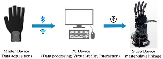 - Due to the urgent need for hand protection and the common problems with existing hand master–slave control technologies, we combined virtual reality technology to propose a design scheme for a master–slave control system using hands based on virtual reality technology. We analyzed and identified the four important components of the system, namely, the hand data collection platform, the back-end data management platform, the Unity3D virtual–physical interaction platform, and the master–slave control platform. The working principles and design schemes of each main part were explained in detail.
