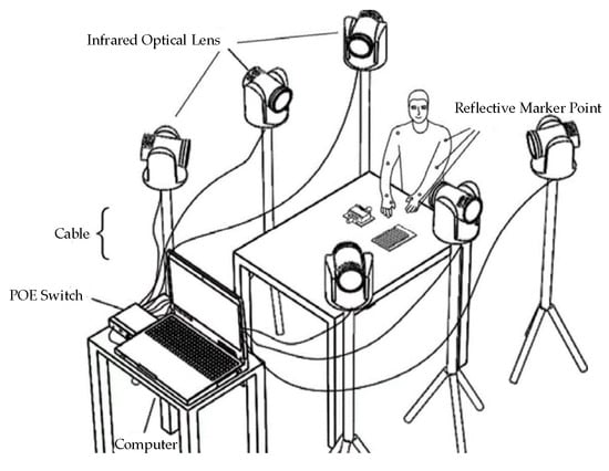 In optical systems, hand motion data are collected and tracked by using optical devices, such as cameras. Hand motions are captured and recognized through hand-tracking algorithms and optical devices. A complete optical system consists of multiple sets of red optical lenses, reflective markers, POE switches, calibration frames, and cables, as shown in Figure 2. A typical capture system for optical motion employs several cameras with high speeds for tracking and monitoring specific attributes from various angles, which are then combined with algorithms that involve a skeleton solution to consummate the capture. In theory, the 3D location of a specific space can be determined at a particular moment if it is simultaneously observed by at least three cameras. When a camera photographs constantly with a significant frame rate, the trajectory may be derived from the sequence of images. Although an optical system can independently capture hand motions, some problems cannot be avoided, such as space limitations, lighting conditions, and the occlusion of motion markers during the capture process. These environmental impacts limit data collection and the smoothness and completeness of the motions, making it difficult for users to achieve an immersive experience. However, the advantage is that such systems do not require additional wearables, do not restrict human freedom of activity, and are commonly used for indoor full-body dynamic data capture.
