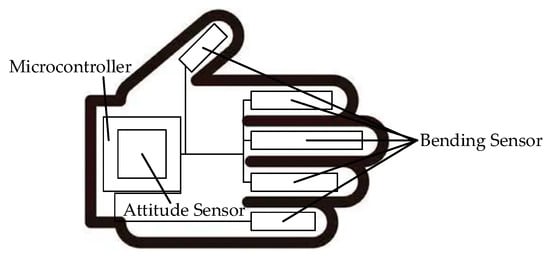 A hand information perception and control system composed of sensors, which is also known as a “data glove”, is comprised of bend sensors, posture sensors, signal receivers, and microcontrollers, as shown in Figure 3. Its small size allows the system to be attached to the user and to adapt to complex environments, thus capturing motion data more flexibly and reliably. By utilizing the relationship between the output voltage and degree of bending of the bend sensors, the motion information of the fingers is calculated. Posture sensors are affixed to the main body parts, and posture signals are transmitted to a microcontroller through wireless transmission methods, such as Bluetooth, for posture calculation. The posture sensors obtain the posture information of the limbs through integrated inertial sensors, gravity sensors, accelerometers, magnetometers, and gyroscopes. In combination with the length information and hierarchical connections of the skeleton, the spatial positions of the joints are calculated. Because such systems are suitable for complex environments, they can capture motion data more accurately and reliably. The accuracy and stability of such systems do not decrease due to environmental factors.