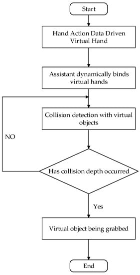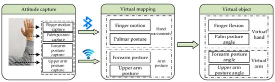 The pivotal first step in hand-based virtual–physical interaction is the real-time capture of the user’s hand position, hand orientation, and finger joint angles. Therefore, the authors constructed an HDT data glove and forearm posture detection module for the measurement of finger flexion, palm posture angles, and forearm posture angles. With these detailed data on hand movements, a virtual–physical interaction program that was developed in Unity3D was used to process the data packets. This established a corresponding mapping relationship between the user’s hand and the virtual hand’s fingers, palm, and arm, thus defining the motion trajectory of the virtual hand. Consequently, this enabled the virtual hand to execute interactive movements in harmony with the user’s hand. The overall structure of the system is illustrated in Figure 4.