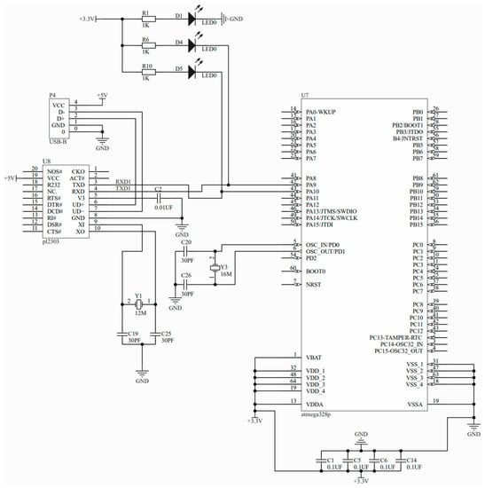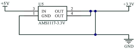 (1) An external 3–5 V power supply was connected to an AMS1117-5-3.3 voltage regulation circuit module. The principle of the AMS1117-5-3.3 voltage regulation circuit is shown in Figure 6. The voltage regulation circuit module transformed the power supply into a stable internal power supply with an output of 5 V (or 3.3 V).