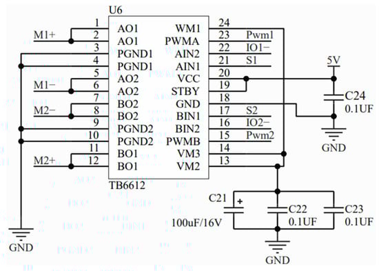 (2) The LM1117-5 voltage regulation circuit module provided a stable power supply for the mpu9250 attitude sensor, the flexible sensor, and the main control system, while the main control system monitored whether the current was stable by using the pulse wave output by the TB6612 current drive chip. The principle of the circuit of the current drive system is shown in Figure 7.