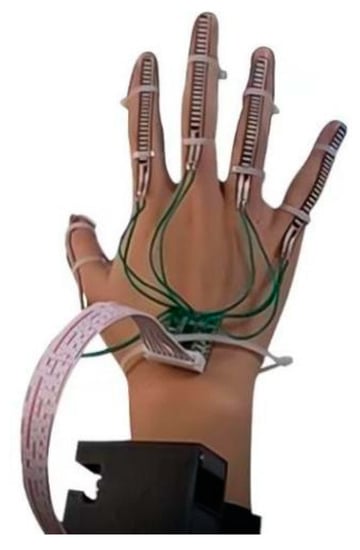- Silva, L.; Dantas, R.; Pantoja, A. Development of a low cost dataglove based on arduino for virtual reality applications. In Proceedings of the 2013 IEEE International Conference on Computational Intelligence and Virtual Environments for Measurement Systems and Applications (CIVEMSA), Milan, Italy, 15–17 July 2013. [Google Scholar]
