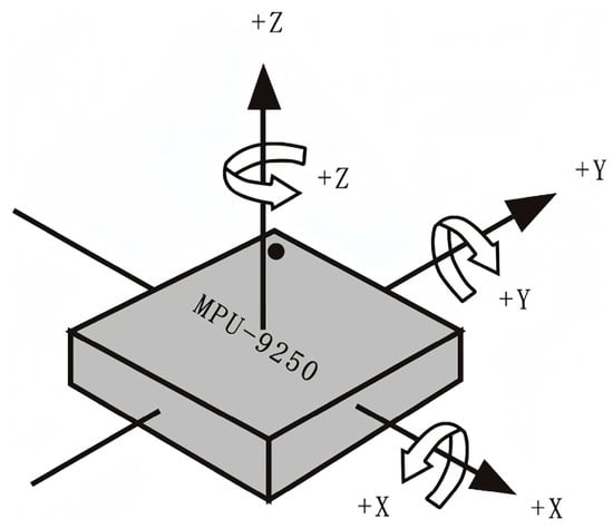 The posture angle solution refers to the angle acquired by accumulating and integrating the acceleration, angular velocity, and magnetic field intensity (all with three axes) via the attitude sensor. The results are the roll angle (roll), pitch angle (pitch), and yaw angle (yaw). The coordinate system used for the posture angle solution was the east–north–sky coordinate system. The module was placed in the positive direction, as shown in Figure 10, with the left as the x-axis, the front as the y-axis, and the top as the z-axis. The order of rotation of the coordinate system when the Euler angle represented the posture was defined as z-y-x, i.e., first rotating around the z-axis, then the y-axis, and, finally, the x-axis.