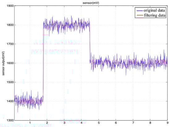 The data output by the flexible sensor were the values of the voltage, which could experience small jumps. Therefore, a cumulative jitter elimination filtering algorithm was used. When the collected data continuously jumped beyond the set valve, this indicated that the overall numerical range of the element had changed. Therefore, a new element was assigned to the output value. If the change did not exceed the threshold or did not continuously exceed the threshold, this indicated that the change in the data was in a small range of noise, which was filtered out, and the output remained at the original value. This algorithm can effectively remove small-range jitters in data, thus making the data smoother. For possible high-amplitude errors, a limited-amplitude filtering algorithm was adopted to identify and eliminate noise that exceeded a certain amplitude and to take the true value of the data within the threshold. The original data were filtered through these two filtering algorithms to make them more realistic and stable. A comparison of the effects before and after filtering is illustrated in Figure 12.