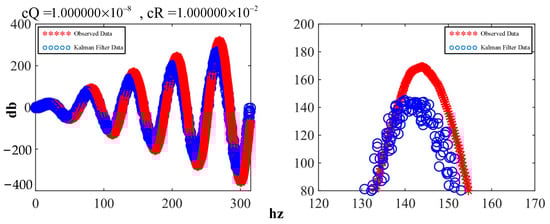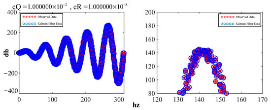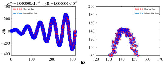 The attitude estimation model derived above was implemented by modifying certain parameter codes—specifically, matrices A and H—as well as the dimensions of other matrices. The results of the implementation are shown in Figure 14, where the blue line on the left represents the observed waveform of sinusoidal data with an increasing amplitude and overlaid with random noise. The red line represents the waveform of the data after they were filtered with the Kalman filter. The right side of the figure shows a localized comparison that clearly indicates that the filtered data were smoother than the original waveform.