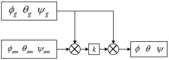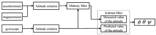 If the angle data would directly calculated from the acceleration data by using Kinematics, there would be a problem due to poor dynamic accuracy because the dynamic data of an accelerometer are not accurate when an object moves, but the advantage is that there is no long-term drift or error accumulation []. Dynamically and precisely measuring a three-axis attitude angle is possible by integrating the angular velocity obtained with a gyroscope, but the disadvantage is that error accumulation and drift occur, and the accumulated error increases with time. The Kalman filter is a data fusion algorithm that combines the data of an accelerometer, magnetometer, and gyroscope to calculate the attitude, and it combines the advantages of all of these sensors to accurately measure the attitude in a dynamic environment. The algorithm’s process is illustrated in Figure 13.