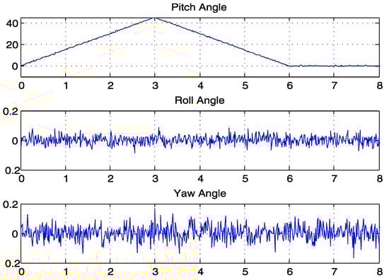 , , and refer to the acceleration values on the three axes. Since the accelerometer could not sense the rotation angle on the z-axis, the magnetometer, which was used to measure the magnetic induction intensity, needed to be employed to help calculate the yaw.