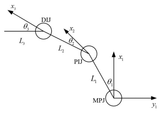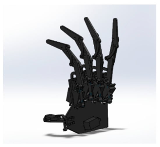 After the above analysis, a structural design with five fingers, three joints, and five degrees of freedom was chosen for the slave interaction device in this project, and an electric drive system was adopted. To enhance the grasping effect of the robotic hand, a three-link coupled underactuated transmission structure was used. Each finger of this structure had a bionic structure with three phalanges and three joints. An SG90 servo was used at the finger–palm joint. This is a type of angle servo driver that is suitable for control systems in which the angle constantly changes and can be maintained. The other two joints were driven in a linkage-coupled manner. This not only made up for the shortcomings of the structure with five fingers, three joints, and five degrees of freedom, but also reduced the number of motors, thereby reducing the design’s complexity and enhancing the anti-interference ability of the robotic hand.