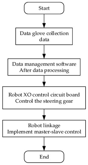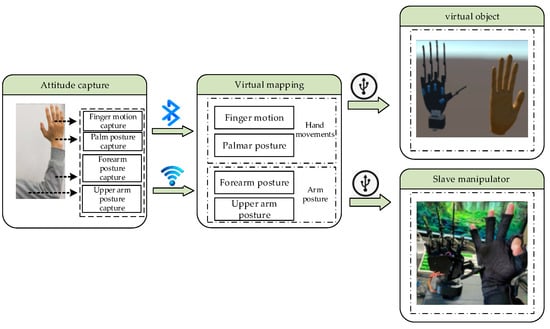 The overall design of the master–slave virtual interaction system for hands mainly includes three parts: a hand data acquisition platform (HDT), a Unity3D-based virtual interaction platform, and a master–slave control platform. The hardware part of the master–slave virtual interaction system for hands is composed of a hand data acquisition platform and a master–slave control platform. The software part of the system mainly consists of a background data management platform and a virtual interaction system platform. The first step in master–slave virtual hand interaction is capturing the position, direction, and finger joint angles of a user’s hand in real time. The hand data acquisition platform uses a posture solution algorithm to analyze and calculate the motion information of the key parts of the hand in real time, transmit it to the background data management system for data fusion and filtering through wireless communication technology, accurately calculate the current spatial coordinates and motion direction, and transmit them to the Unity3D-based virtual interaction platform and master–slave control platform through serial port communication for synchronous mapping of the operator’s hand motion and posture. The Interactive process of the master–slave virtual hand interaction system is shown in Figure 1.