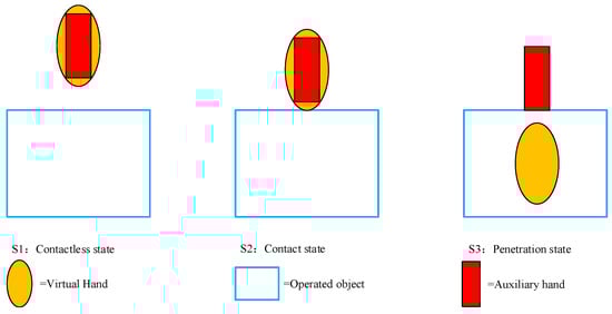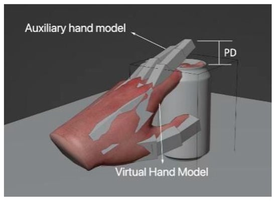 - In research on virtual–real interactions of the hand, we proposed a proxy hand solution, which solved the problem of mutual penetration between the virtual hand and virtual objects during the virtual interaction process. For the judgement of stable grasping, two judgement conditions were proposed, which addressed the non-immersive experience brought by the lack of physical constraints in the virtual world.