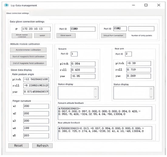 Data acquisition is crucial to this system. The constructed HDT data glove employed flexible sensors [] and posture sensors as hand data collection units, thus facilitating the mapping of virtual palm movements. In the forearm posture tracking system, posture sensors were also used in the forearm posture detection module. This module’s primary function was to capture real-time forearm posture angles and track the hand’s motion trajectory in space. The data captured by the sensors were processed by the glove’s control unit and the forearm posture module through a Kalman posture fusion algorithm and by using data-amplitude-limit jitter reduction. The acquired hand motion data were then transmitted to the host computer via Bluetooth and Wi-Fi (wireless communication) for data fusion analysis, and the current spatial coordinates and motion direction were then calculated.