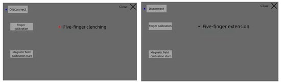 (1) Initial finger calibration: The user wore the data glove and performed fist-clenching and finger-stretching movements five times. The system recorded the range of finger movement and normalized it, as shown in Figure 31.