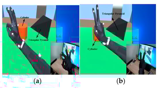 Virtual reality technology, which is one of the most powerful human–computer interfaces, has seen rapid development in recent years. Its applications have been extensively employed in various fields, such as simulation training [], medical rehabilitation [], and manufacturing []. Hand-based virtual–physical interactions have long been a research focus, as humans heavily rely on their hands to interact with the external world []. Thus, using both hands for natural and flexible manipulation of virtual objects has become a primary choice for users. This mode of interaction is more intuitive and convenient than traditional methods, such as those involving a mouse, keyboard, or touch screen [], and it aligns better with human behavioral habits and cognitive logic.