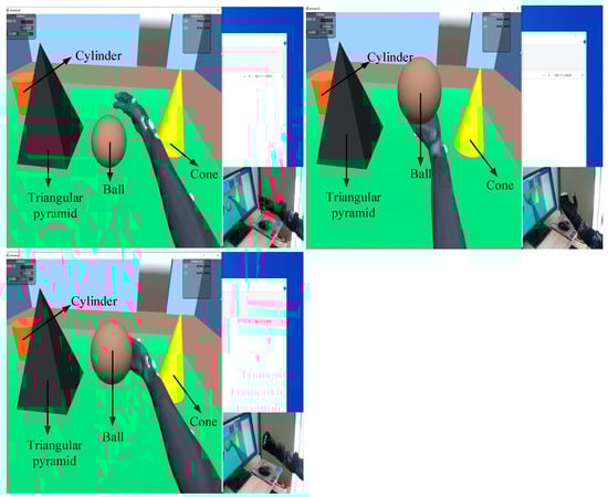 Therefore, from the static interaction experiment, it was found that the motion of the virtual hand essentially aligned with the human hand’s movement, the jitter phenomenon was not pronounced, and, overall, it satisfied the requirements for the system.