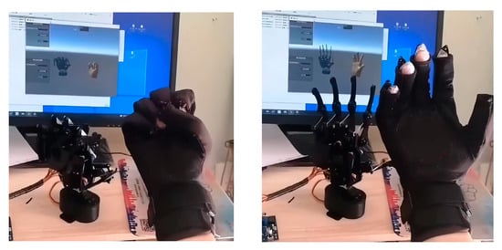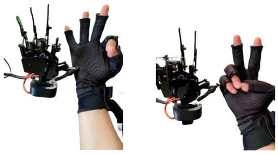 With the master–slave control system and virtual interaction system, the system adjustments were completed. The results of the master–slave control of the hand based on virtual reality are illustrated in Figure 40.