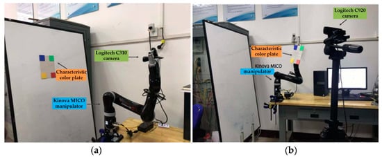 Intelligent robots with sensing abilities have been recognized as the mainstream trend in robot development. Among many robot sensors, a vision sensor has become one of the most important due to its large amount of information, wide range of applications, and non-contact characteristics []. A vision sensor can increase the adaptability of a robot to the surrounding environment and expand its application field. This idea directly gives birth to robot vision servo control technology []. Robot visual servo control is the use of visual sensors to indirectly detect the current posture of the robot or the relative posture of the robot to the target object; on this basis, the robot positioning control or trajectory tracking is realized. Thus, robot visual servo control makes an important control means of the robot system [].