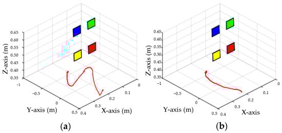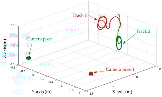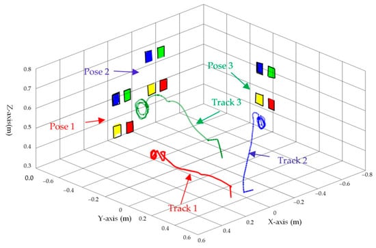 The configuration of ETH is shown in Figure 2b. The LogitechC920 is selected as the fixed camera in this experiment. The reference coordinate system of the camera adopts the following two groups of different poses; the three-dimensional space trajectory of its end-effector is shown in Figure 10.