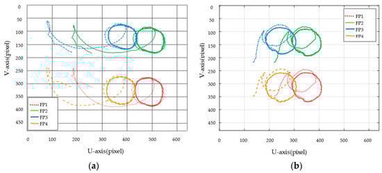 Image plane trajectory of each feature point when the camera is located in different positions (ETH configuration). (a) Pose 1; (b) Pose 2.