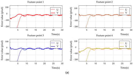 On the other hand, a small control gain can ensure that the feature points in the image space have a good error convergence curve so that the manipulator moves along a smooth three-dimensional trajectory to ensure the reliability of visual servo control. In the initial pose adjustment stage, the IBUVS-F scheme proposed in this paper can effectively reduce the torque output, keep the manipulator attitude stable, and significantly shorten the convergence time, which contributes to the improvement of the control quality of IBUVS.