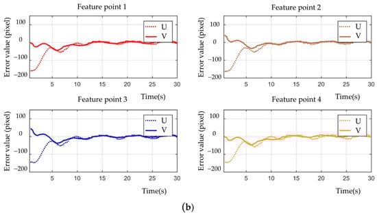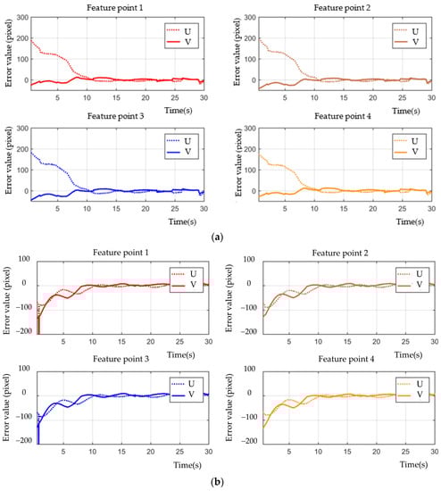 Image convergence curves of each feature point when the camera is located in different positions (ETH configuration). (a) Pose 1; (b) Pose 2.