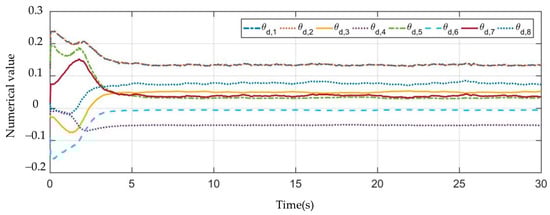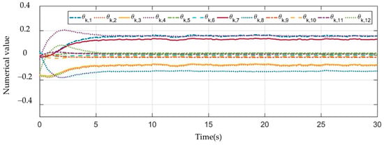 It can be observed from the above experimental results that, at the beginning of the servo task, the Jacobian matrix determined by the IBUVS control scheme in this paper according to the initial estimation parameters has a large deviation from the actual Jacobian matrix, resulting in the system being far away from the equilibrium point. This situation is further aggravated when the initial estimation deviates greatly from the actual value. However, with the continuous increase of the control period, the parameters to be estimated in the system are iterated along the negative gradient direction of the image error quantity and converge to a set of constant values proportional to the true value (as shown in Figure 6 and Figure 7). Currently, the Jacobian estimated matrix approaches the actual Jacobian matrix, and the image space error gradually converges.